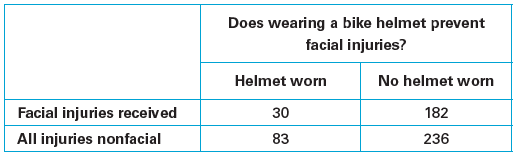 Assuming that we want to use the data in the table below to test for independence between wearing a helmet and receiving facial injuries in a bicycle accident, find the expected frequency for the cell with an observed frequency of 83.