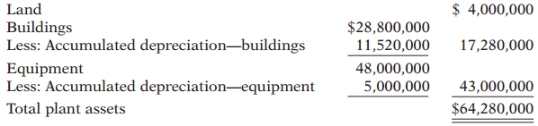 Land $ 4,000,000 Buildings Less: Accumulated depreciation-buildings $28,800,000 11,520,000 17,280,000 Equipment Less: Accumulated depreciation-equipment Total plant assets 48,000,000 5,000,000 43,000,000 $64,280,000