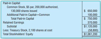 Paid-in Capital: Common Stock, $5 par, 200,000 authorized, 130,000 shares issued Additional Paid-in Capital-Common Total Paid-in Capital Retained Earnings $ 650,000 100,000 $ 750,000 370,000 Subtotal $1,120,000 Less: Treasury Stock, 2,100 shares at cost Total Stockholders' Equity (58,800) $1,061,200