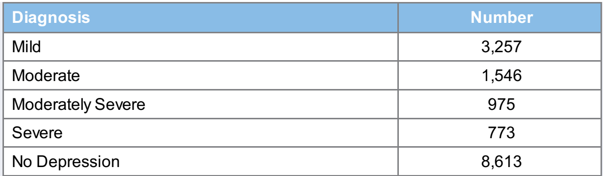 Diagnosis Number Mild 3,257 Moderate 1,546 Moderately Severe 975 Severe 773 No Depression 8,613
