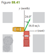 At the intersection of Texas Avenue and University Drive, a yellow subcompact car with mass 950 kg traveling east on University collides with a red pickup truck with mass 1900 kg that is traveling north on Texas and has run a red light (Fig. E8.41). The two vehicles stick together as a result of the collision, and the wreckage slides at 16.0 m/s in the direction 24.0° east of north. Calculate the speed of each vehicle before the collision. The collision occurs during a heavy rainstorm; ignore friction forces between the vehicles and the wet road.