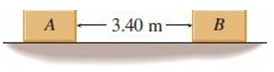 At time t = 0, block A of mass 0.225 kg and block B of mass 0.600 kg rest on a horizontal frictionless surface a distance 3.40 m apart, with block A located to the left of block B. A horizontal force of 2.00 N directed to the right is applied to block A for a time interval Ît = 0.100 s. During the same time interval, a 5.00 N horizontal force directed to the left is applied to block B. How far from B's initial position do the two blocks meet? How much time has elapsed from t = 0 until the blocks meet?