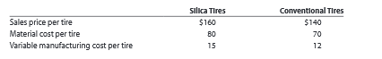 silica Tires $160 Conventional Tires Sales price per tire Material cost per tire Variable manufacturing cost per tire $140 B0 70 15 12