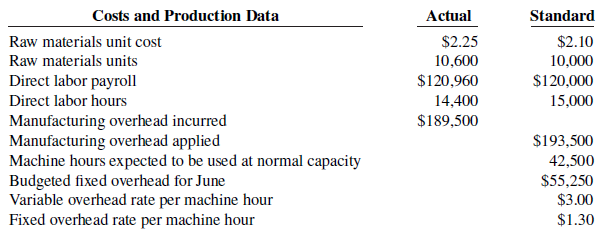 Costs and Production Data Actual Standard Raw materials unit cost $2.25 $2.10 10,000 Raw materials units 10,600 Direct labor payroll $120,960 $120,000 15,000 Direct labor hours 14,400 Manufacturing overhead incurred Manufacturing overhead applied Machine hours expected to be used at normal capacity Budgeted fixed overhead for June Variable overhead rate per machine hour Fixed overhead rate per machine hour $189,500 $193,500 42,500 $55,250 $3.00 $1.30