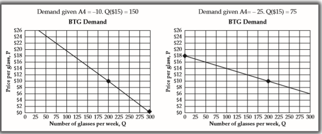 Here is a second, related problem: A successful advertising campaign has increased BTG demand by 25 percent at any price relative to pre-advertising levels. Pre-advertising demand is assumed to be the same as was given in the initial 1Demand scenario (200 glasses are sold at a price of $10 per glass, and each dollar price change is associated with a twenty glass-per-week change in sales).