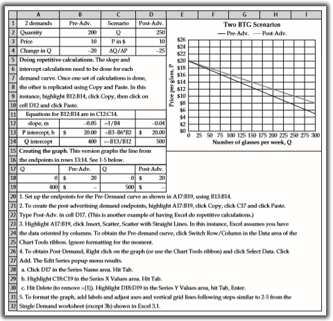 One final scenario: Try doing this problem yourself using the worksheet you created or the 2Demands worksheet. Consider an alternative post advertising scenario. Rather than selling 25 percent more glasses at any price, you find that if you charge 25 percent more per glass, then you are able to maintain the same number of BTG glasses sold. Adjust D2:D4 to model this new scenario and Copy and Paste (using Paste-Special as described above) your answer graph to a fresh sheet of paper; include answers to a and b: