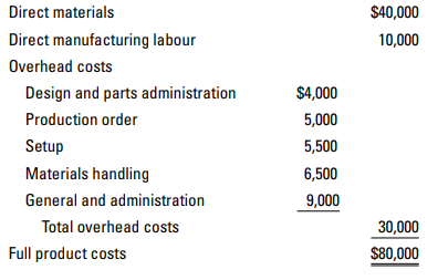 Direct materials $40,000 Direct manufacturing labour 10,000 Overhead costs Design and parts administration $4,000 Production order 5,000 Setup 5,500 Materials handling 6,500 General and administration 9,000 Total overhead costs 30,000 Full product costs $80,000
