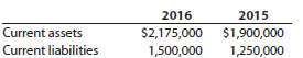 2016 2015 Current assets $2,175,000 $1,900,000 Current liabilities 1,500,000 1,250,000