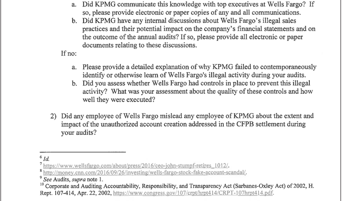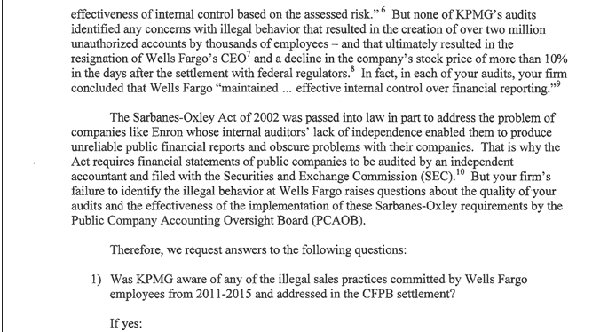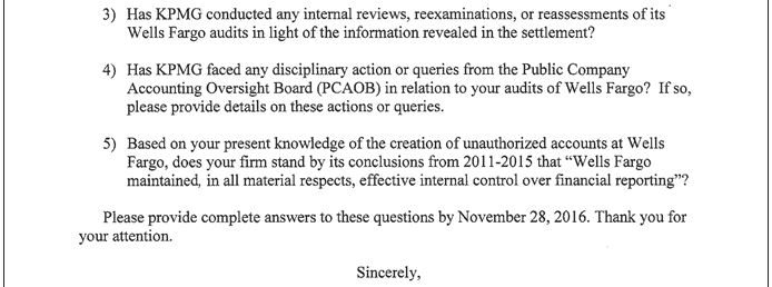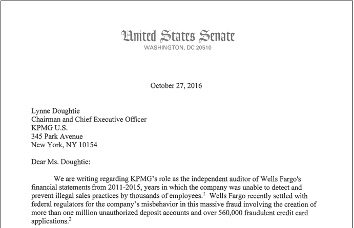 At the end of October 2016, Senator Elizabeth Warren (Democrat – Massachusetts), Senator Bernie Sanders (Democrat – Vermont), Senator Mazie Hirono (Democrat - Hawaii) and Senator Edward Markey (Democrat - Massachusetts) issued a letter9 to Lynne Doughtie, Chairman and CEO of KPMG that contained a number of questions for the firm to answer by November 28, 2016. This letter is reproduced on the pages that follow.