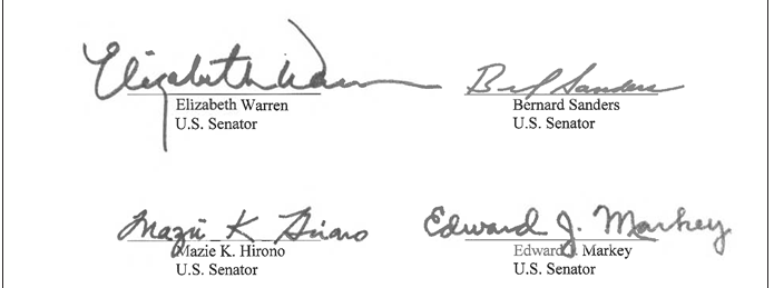 At the end of October 2016, Senator Elizabeth Warren (Democrat â Massachusetts), Senator Bernie Sanders (Democrat â Vermont), Senator Mazie Hirono (Democrat - Hawaii) and Senator Edward Markey (Democrat - Massachusetts) issued a letter9 to Lynne Doughtie, Chairman and CEO of KPMG that contained a number of questions for the firm to answer by November 28, 2016. This letter is reproduced on the pages that follow.