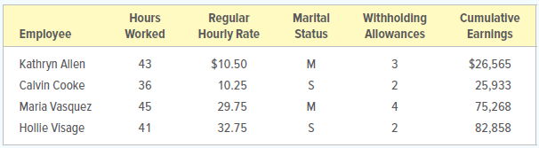 Barbara Merino operates Merino Consulting Services. She has four employees and pays them on an hourly basis. During the week ended November 12, 20X1, her employees worked the number of hours shown below. Information about their hourly rates, marital status, withholding allowances, and cumulative earnings for the year prior to the current pay period also appears below.