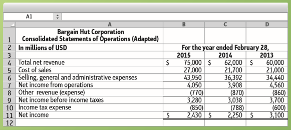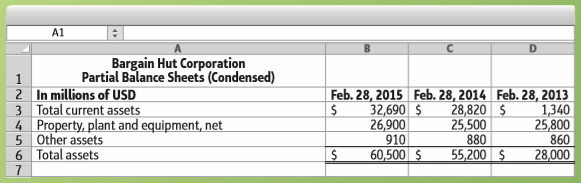 A1 Bargain Hut Corporation Consolidated Statements of Operations (Adapted) 2 In millions of USD 3 4 Total net revenue 5 Cost of sales 6 Selling, general and administrative expenses 7 Net income from operations 8 Other revenue (expense) 9 Net income before income taxes 10 Income tax expense 11 Net income 1 2015 75,000 $ 27,000 43,950 4,050 (770) 3,280 (850) 2,430 $ For the year ended February 28, 2014 62,000 $ 21,700 36,392 3,908 (870) 3,038 (788) 2,250 $ 2013 60,000 21,000 34,440 4,560 |(860) 3,700 (600) 3,100 12 A1 Bargain Hut Corporation Partial Balance Sheets (Condensed) 1 2 In millions of USD 3 Total current assets 4 Property, plant and equipment, net 5 Other assets 6 Total assets Feb. 28, 2015 Feb. 28, 2014 Feb. 28, 2013 28,820 $ 25,500 880 55,200 $ 32,690 $ 26,900 910 60,500 $ 1,340 25,800 860 28,000 7