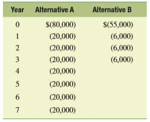 Year Alternative A Alternative B $(80,000) $(55,000) 1 (20,000) (6,000) (20,000) (6,000) 3 (20,000) (6,000) 4 (20,000) 5 (20,000) 6. (20,000) (20,000)