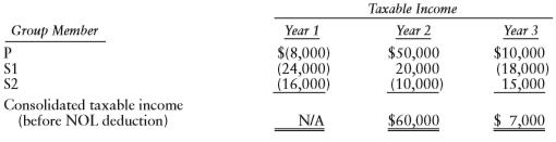Taxable Income Year 2 $50,000 20,000 (10,000) Group Member Year 1 Year 3 P S1 S2 $(8,000) (24,000) (16,000) $10,000 (18,000) 15,000 Consolidated taxable income (before NOL deduction) $ 7,000 N/A $60,000