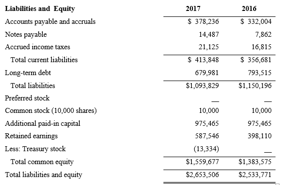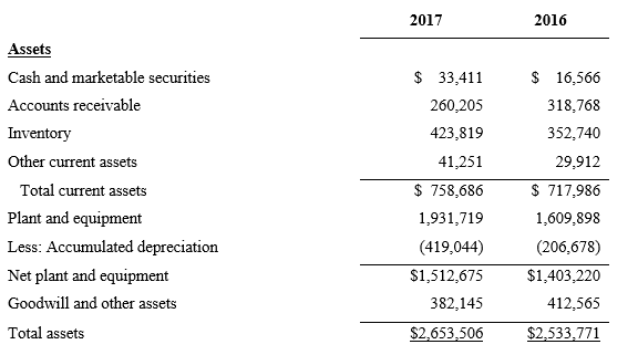 2017 2016 Assets Cash and marketable securities $ 33,411 $ 16,566 Accounts receivable 260,205 318,768 Inventory 423,819 352,740 Other current assets 41,251 29,912 Total current assets $ 758,686 $ 717,986 Plant and equipment 1,931,719 1,609,898 Less: Accumulated depreciation (419,044) (206,678) Net plant and equipment $1,512,675 $1,403,220 Goodwill and other assets 382,145 412,565 Total assets $2,653,506 $2,533,771 Liabilities and Equity 2017 2016 Accounts payable and accruals $ 378,236 $ 332,004 Notes payable 14,487 7,862 Accrued income taxes 21,125 16,815 Total current liabilities $ 413,848 $ 356,681 Long-term debt 679,981 793,515 Total liabilities $1,093,829 $1,150,196 Preferred stock Common stock (10,000 shares) 10,000 10,000 Additional paid-in capital 975,465 975,465 Retained earnings 587,546 398,110 Less: Treasury stock (13,334) Total common equity $1,559,677 $1,383,575 Total liabilities and equity $2,653,506 $2,533,771