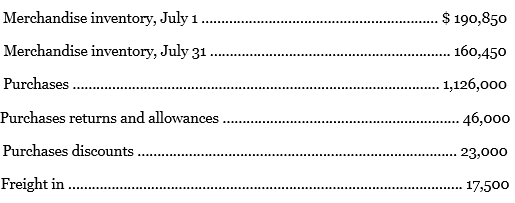 Merchandise inventory, July 1 $ 190,850 Merchandise inventory, July 31 160,450 Purchases 1,126,000 .... Purchases returns and allowances . - 46,000 Purchases discounts. 23,000 Freight in . . 17,500