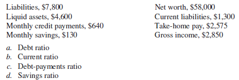 > Use the following items to determine the total assets, total liabilities, net worth, total cash inflows, and total cash outflows. a. Total assets $ b. Total liabilities $ c. Net worth $ d. Total cash inflows $ e. Total cash outflows $