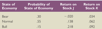 Probability of State of Economy State of Return on Return on Economy Stock J Stock K Вear 30 -.020 .034 Normal .55 .138 .062 Bull .15 .218 .092