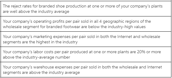 The reject rates for branded shoe production at one or more of your company's plants are well above the industry average Your company's operating profits per pair sold in all 4 geographic regions of the wholesale segment for branded footwear are below the industry-high values Your company's marketing expenses per pair sold in both the Internet and wholesale segments are the highest in the industry Your company's labor costs per pair produced at one or more plants are 20% or more above the industry-average number Your company's warehouse expenses per pair sold in both the wholesale and Internet segments are above the industry average