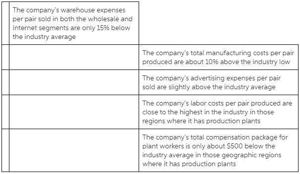 The company's warehouse expenses per pair sold in both the wholesale and Internet segments are only 15% below the industry average The company's total manufacturing costs per pair produced are about 10% above the industry low The company's advertising expenses per pair sold are slightly above the industry average The company's labor costs per pair produced are close to the highest in the industry in those regions where it has production plants The company's total compensation package for plant workers is only about $500 below the industry average in those geographic regions where it has production plants