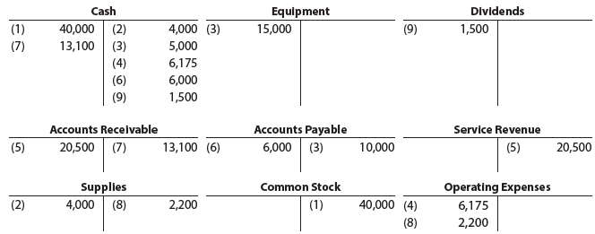 Cash Dividends Equipment 15,000 (1) 40,000 (2) 4,000 (3) 1,500 (7) 13,100 (3) 5,000 (4) 6,175 (6) 6,000 (9) 1,500 Accounts Receivable Accounts Payable Service Revenue (5) 20,500 | (7) 13,100 (6) 6,000 (3) 10,000 (5) 20,500 Supplies Common Stock Operating Expenses (2) 4,000 (8) 2,200 (1) 40,000 (4) 6,175 (8) 2,200 Account Debited Account Credited Effect Туре stockholders'equity Transaction Туре Effect (1) asset +