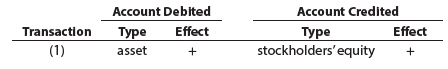 Indicate for each debit and each credit: (a) whether an asset, liability, stockholdersâ equity, dividend, revenue, or expense account was affected and (b) whether the account was increased (+) or decreased (â). Present your answers in the following form, with transaction (1) given as an example: