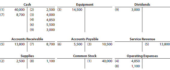 Cash Equipment Dividends (1) 40,000 (2) 2,500 (3) 14,500 (9) 3,000 (7) 8,700 (3) 4,000 (4) 4,850 (6) 5,500 (9) 3,000 Accounts Receivable Accounts Payable Service Revenue (5) 13,800 (7) 8,700 (6) 5,500 (3) 10,500 13,800 Supplies Common Stock Operating Expenses (2) 2,500 (8) 1,100 (1) 40,000 (4) 4,850 (8) 1,100 Account Debited Account Credited Transaction Туре Effect Туре Effect (1) asset stockholders'equity + +