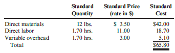 Standard Standard Price Standard Quantity 12 lbs. (rate in $) Cost Direct materials $ 3.50 $42.00 Direct labor 1.70 hrs. 11.00 18.70 Variable overhead 1.70 hrs. 3.00 5.10 Total $65.80