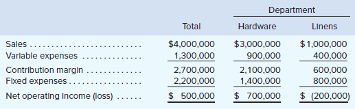 A study indicates that $340,000 of the fixed expenses being charged to Linens are sunk costs or allocated costs that will continue even if the Linens Department is dropped. In addition, the elimination of the Linens Department will result in a 10% decrease in the sales of the Hardware Department.