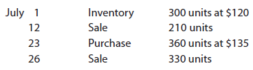 > Beginning inventory, purchases, and sales for Item Doodad are as follows: Assuming a perpetual inventory system and using the first-in, first-out (FIFO) method, determine (a) The cost of merchandise sold on July 24 and (b) The inventory on July 31.
