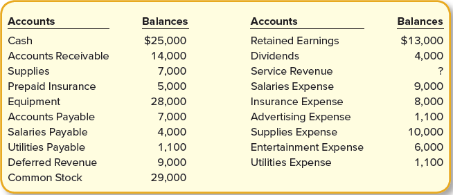 Prepare a trial balance by placing amounts in the appropriate debit or credit column and determining the balance of the Service Revenue account.