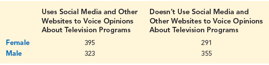 c. Let F denote the event that the respondent is female and A denote the event that the respondent uses social media and other websites to voice opinions about television programs. Are events F and A independent?