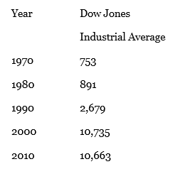 Below you will find the yearly average values of the Dow Jones Industrial Average, the most popular index of stock market prices, for five different years. The Consumer Price Index for each year (on a base of 1982â1984 = 100) can be found on the inside back cover of this book. Use these numbers to deflate all five stock market values. Do real stock prices always rise every decade?