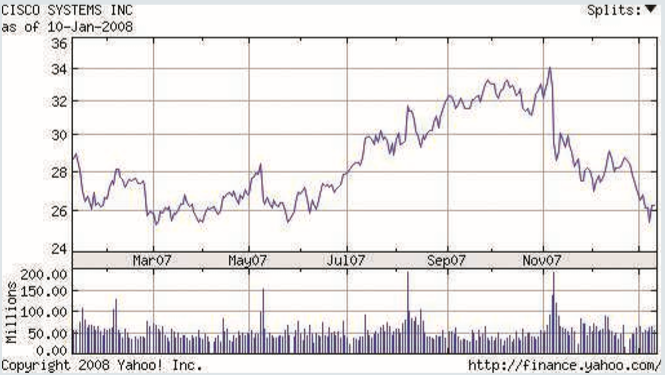CISCO SYSTEMS INC as of 10-Jan-2008 Splits: 36 34 32 30 28 26 24 Mar07 May07 Jul07 Sep07 Nov07 200.00 150.00 100.00 0.00 Copyright 2008 Yahoo! Inc. http://finance.yahoo.com/ Millions