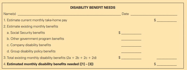 DISABILITY BENEFIT NEEDS Name(s) Date 1. Estimate current monthly take-home pay 2. Estimate existing monthly benefits a. Social Security benefits b. Other government program benefits c. Company disability benefits d. Group disability policy benefits 3. Total existing monthly disability benefits (2a + 2b + 2c + 2d) 4. Estimated monthly disability benefits needed ([1]– [3]) %24