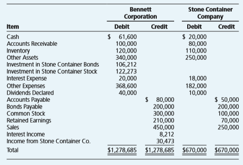Bennett Stone Container Corporation Company Item Debit Credit Debit Credit $ 20,000 80,000 110,000 250,000 $ 61,600 100,000 120,000 340,000 106,212 122,273 20,000 368,600 40,000 Cash Accounts Receivable Inventory Other Assets Investment in Stone Container Bonds Investment in Stone Container Stock Interest Expense Other Expenses Dividends Declared Accounts Payable Bonds Payable Common Stock Retained Earnings Sales Interest Income 18,000 182,000 10,000 $ 80,000 200,000 300,000 210,000 450,000 8,212 30,473 $1,278,685 $1,278,685 $670,000 $670,000 $ 50,000 200,000 100,000 70,000 250,000 Income from Stone Container Co. Total