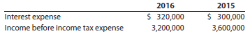2016 2015 Interest expense $ 320,000 $ 300,000 Income before income tax expense 3,200,000 3,600,000