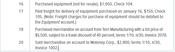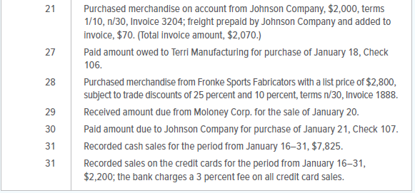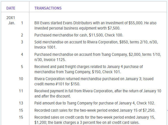 Bill Evans began Evans Distributors, a sporting goods distribution company, in January 20X1 and engaged in the transactions below. Assume Evans Distributors and its customers take advantage of all cash discounts.