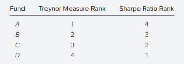 Bill Smith is evaluating the performance of four large-cap equity portfolios: Funds A, B, C, and D. As part of his analysis, Smith computed the Sharpe ratio and the Treynor measure for all four funds. Based on his finding, the ranks assigned to the four funds are as follows: