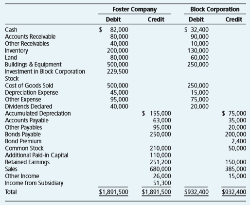 Foster Company Block Corporation Debit Credit Debit Credit $ 82,000 80,000 40,000 200,000 80,000 500,000 229,500 $ 32,400 90,000 10,000 130,000 60,000 250,000 Cash Accounts Receivable Other Receivables Inventory Land Buildings & Equipment Investment in Block Corporation Stock 500,000 45,000 95,000 40,000 Cost of Goods Sold Depreciation Expense Other Expense Dividends Declared Accumulated Depreciation Accounts Payable Other Payables Bonds Payable Bond Premium 250,000 15,000 75,000 20,000 $ 155,000 63,000 95,000 250,000 $ 75,000 35,000 20,000 200,000 2,400 50,000 Common Stock Additional Paid-in Capital Retained Earnings Sales Other Income Income from Subsidiary 210,000 110,000 251,200 680,000 26,000 51,300 $1,891,500 150,000 385,000 15,000 Total $1,891,500 $932,400 $932,400