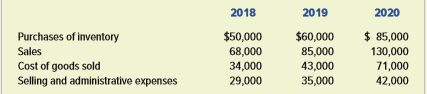2018 2019 2020 Purchases of inventory $50,000 $ 85,000 $60,000 85,000 43,000 35,000 Sales 68,000 130,000 Cost of goods sold Selling and administrative expenses 34,000 71,000 29,000 42,000