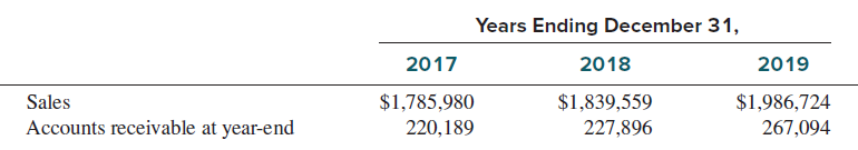 Years Ending December 31, 2017 2018 2019 Sales $1,785,980 $1,839,559 $1,986,724 Accounts receivable at year-end 220,189 227,896 267,094