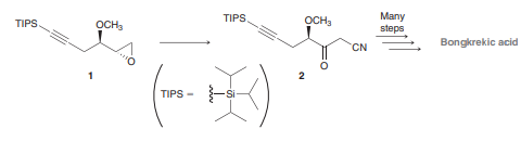 Bongkrekic acid is an extremely potent toxin produced by the microorganism Pseudomonas cocovenenans. Synthetic routes for preparing this compound have been sought in order to confirm its chemical structure and elucidate its biological mechanism. During a laboratory synthesis of bongkrekic acid, compound 1 was converted to compound 2. Propose an efficient synthesis for the conversion of 1 to 2.