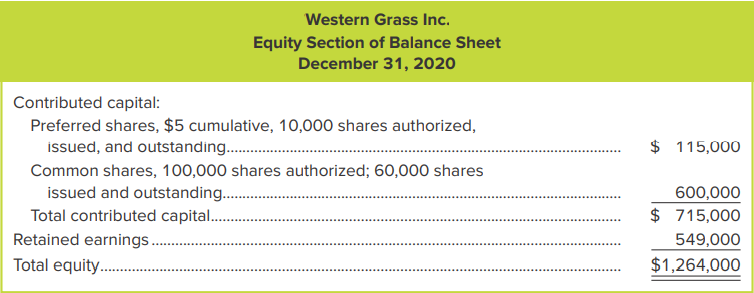 > The balance sheet for QuickStream Inc. reported the following components of equity on December 31, 2020: Common shares, unlimited shares authorized, 100,000 shares issued and outstanding:$ 480,000 Retained earnings: 648,000 Total equity: $1,128,000 The
