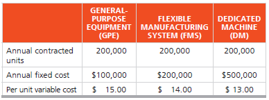 GENERAL- PURPOSE EQUIPMENT MANUFACTURING (GPE) FLEXIBLE DEDICATED МАCHINE SYSTEM (FMS) (DM) Annual contracted 200,000 200,000 200,000 units Annual fixed cost $100,000 $200,000 $500,000 Per unit variable cost $ 15.00 $ 14.00 $ 13.00