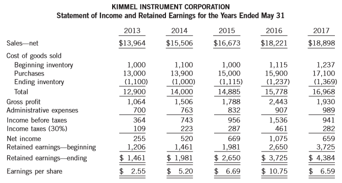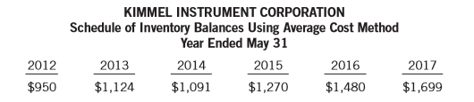KIMMEL INSTRUMENT CORPORATION Statement of Income and Retained Earnings for the Years Ended May 31 2013 2014 2015 2016 2017 Sales-net $13,964 $15,506 $16,673 $18,221 $18,898 Cost of goods sold Beginning inventory Purchases 1,000 13,000 (1,100) 12,900 1,064 700 1,100 13,900 (1,000) 14,000 1,506 1,000 15,000 (1,115) 14,885 1,788 1,237 17,100 (1,369) 16,968 1,930 989 1,115 15,900 (1,237) Ending inventory Total 15,778 Gross profit Administrative expenses 2,443 763 832 907 Income before taxes Income taxes (30%) 743 1,536 461 364 956 941 109 223 287 282 Net income 255 520 669 1,075 2,650 $ 3,725 659 Retained earnings-beginning 1,206 1,461 1,981 3,725 Retained earnings ending $ 1,981 $ 2,650 $ 4,384 $ 6.59 $ 1,461 Earnings per share $ 2.55 $ 5.20 $ 6.69 $ 10.75 KIMMEL INSTRUMENT CORPORATION Schedule of Inventory Balances Using Average Cost Method Year Ended May 31 2012 2013 2014 2015 2016 2017 $950 $1,124 $1,091 $1,270 $1,480 $1,699