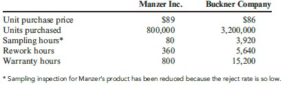 Bowman Company manufactures cooling systems. Bowman produces all the parts necessary for its product except for one electronic component, which is purchased from two local suppliers: Manzer Inc. and Buckner Company. Both suppliers are reliable and seldom deliver late; however, Manzer sells the component for $89 per unit, while Buckner sells the same component for $86. Bowman purchases 80% of its components from Buckner because of its lower price. The total annual demand is 4,000,000 components.