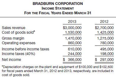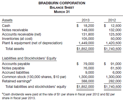BRADBURN CORPORATION BALANCE SHEET MARCH 31 Assets 2013 2012 $ 12,500 $ 18,200 148,000 131,800 105,000 1,449,000 Cash $ Notes receivable Accounts receivable (net) Inventories (at cost) Plant & equipment (net of depreciation) 132,000 125,500 50,000 1,420,500 $1,740,500 Total assets $1,852,000 Liabilities and Stockholders' Equity $ 79,000 76,000 9,000 1,300,000 388,000 $ 91,000 61,500 6,000 1,300,000 282,000 Accounts payable Notes payable Accrued liabilities Common stock (130,000 shares, $10 par) Retained earnings Total liabilities and Stockholders' Equity $1,852,000 $1,740,500 "Cash dividends were paid at the rate of $1 per share in fiscal year 2012 and $2 per share in fiscal year 2013. BRADBURN CORPORATION INCOME STATEMENT FOR THE FISCAL YEARS ENDED MARCH 31 2013 2012 $3,000,000 1,530,000 $2,700,000 1,425,000 Sales revenue Cost of goods sold Gross margin Operating expenses 1,470,000 1,275,000 780,000 860,000 Income before income taxes 610,000 495,000 198,000 Income taxes (40%) 244,000 $ 366,000 $ 297,000 Net income "depreciation charges on the plant and equipment of $100,000 and $102,500 for fiscal years ended March 31, 2012 and 2013, respectively, are included in cost of goods sold.