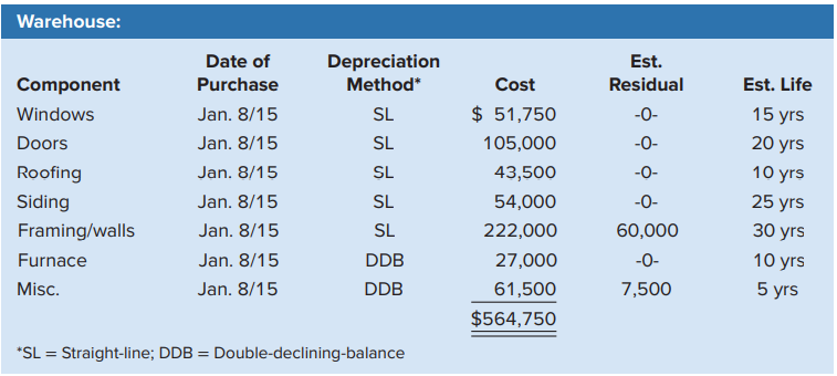 During 2020, it was determined that the original useful life on the warehouse doors should be reduced to a total of 12 years and that the residual value should be $23,100. On January 3, 2020, the furnace broke down unexpectedly. It was replaced the next day with a new one costing $39,000, purchased on account (the old furnace was scrapped). The new furnace had an estimated residual value of $7,500 and an estimated life of 16 years and would continue to be depreciated using the double-declining-balance method.