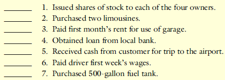 1. Issued shares of stock to each of the four owners. 2. Purchased two limousines. 3. Paid first month's rent for use of garage. 4. Obtained loan from local bank. 5. Received cash from customer for trip to the airport. 6. Paid driver first week's wages. 7. Purchased 500-gallon fuel tank.
